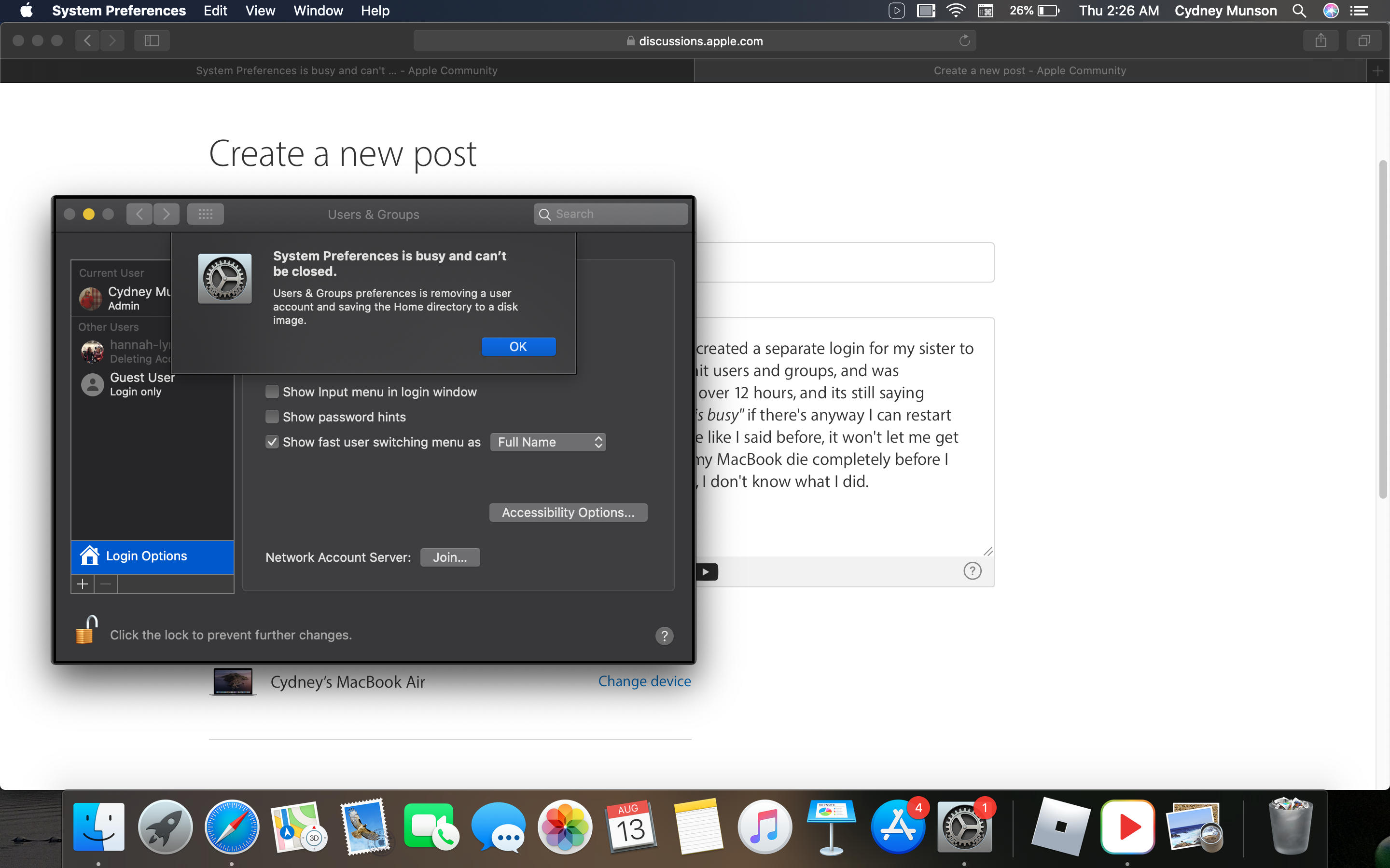 hey!! so I just got my MacBook Air less than a week ago, and I had created a separate login for my sister to use, but she then just got her own computer. I went in to setting, hit users and groups, and was attempting to delete her login. it was letting me, but now its been over 12 hours, and its still saying "deleting account.." I now can't close it because 'system preferences is busy" if there's anyway I can restart my computer without having to get into the main settings because like I said before, it won't let me get there. or if there is anyway I can make it finish. I even tried letting my MacBook die completely before I turned it on again, only to see its still there. somebody please help, I don't know what I did.