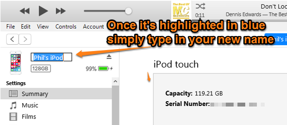 how do i rename an ipod in itunes? I was told I merely needed to click on the name on the left side (where it displays the device), but when I click NOTHING HAPPENS. A rename should be a no-brainer to do. Please help.