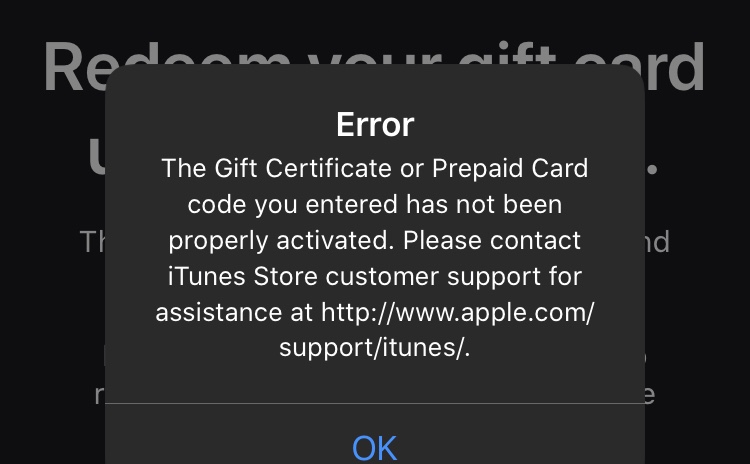 error The gift certificate or prepaid card code you entered is not activated properly. Please contact iTunes Support at http://www.apple.com/support/itunes/ for support in the iTunes Store.