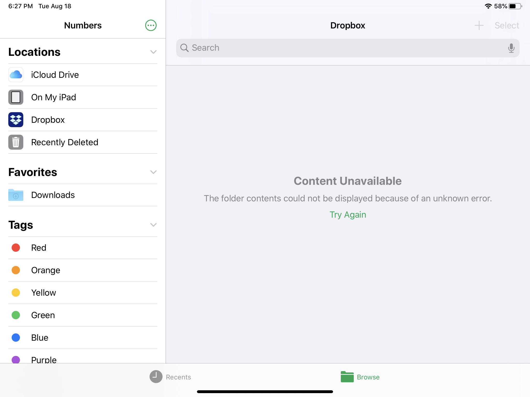 When I try and import an excel spreadsheet from Dropbox on my iPad into Numbers on my iPad, I keep getting the following error message: