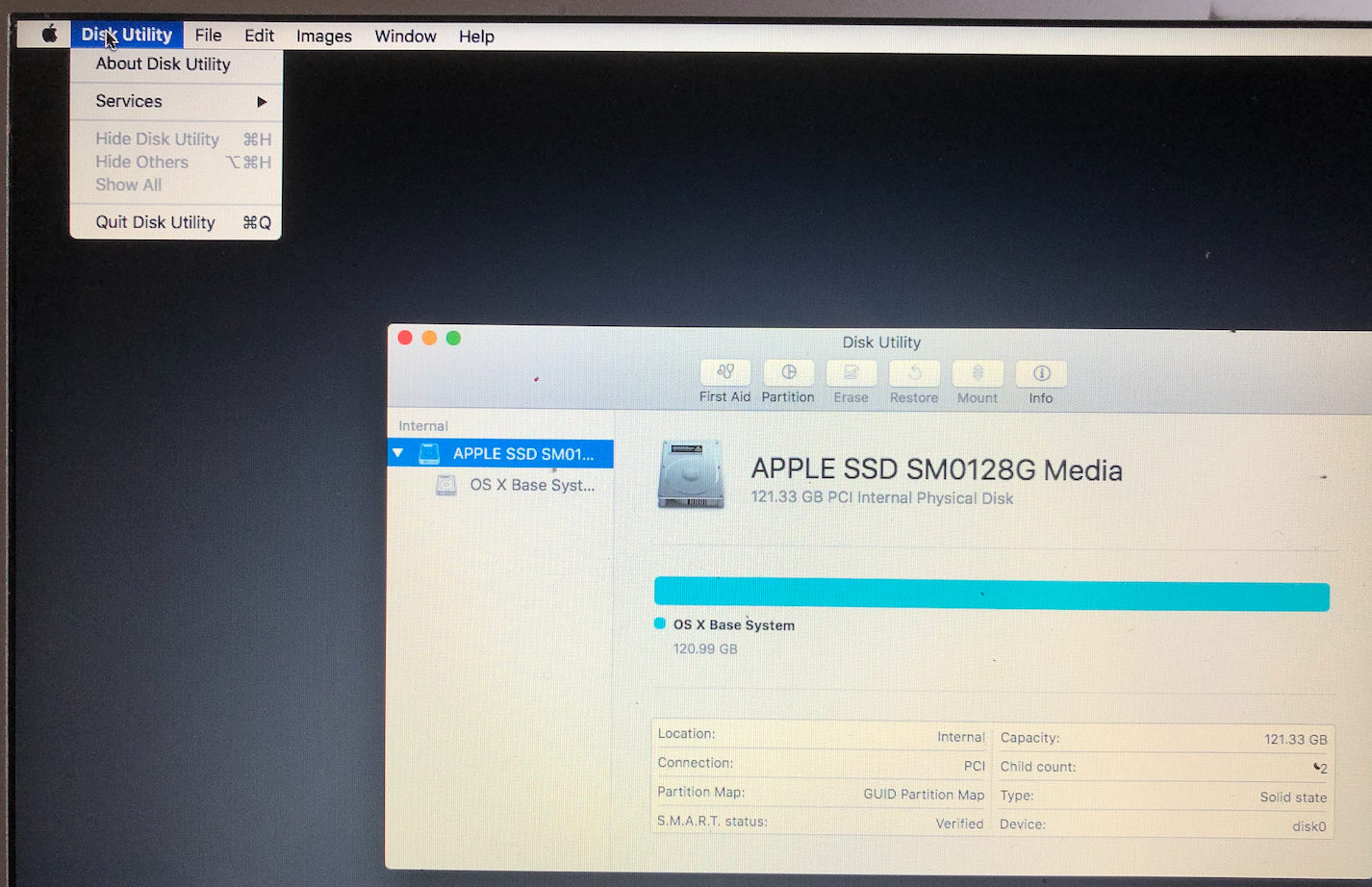 I only see top bar "Disk Utility" "File" "Edit" "Images" "Window" " Help"