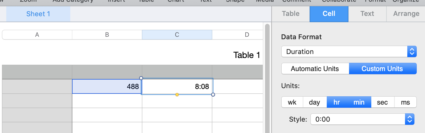 If you would, instead, like to type 488 into a cell and have it reformat into 08:08 in the same cell, first use the formatting sidebar on the right to format the cell as a duration with the units hours and minutes and displayed as 00:00. When entering the 488, put a "m" on the end so it knows it is minutes. 488m