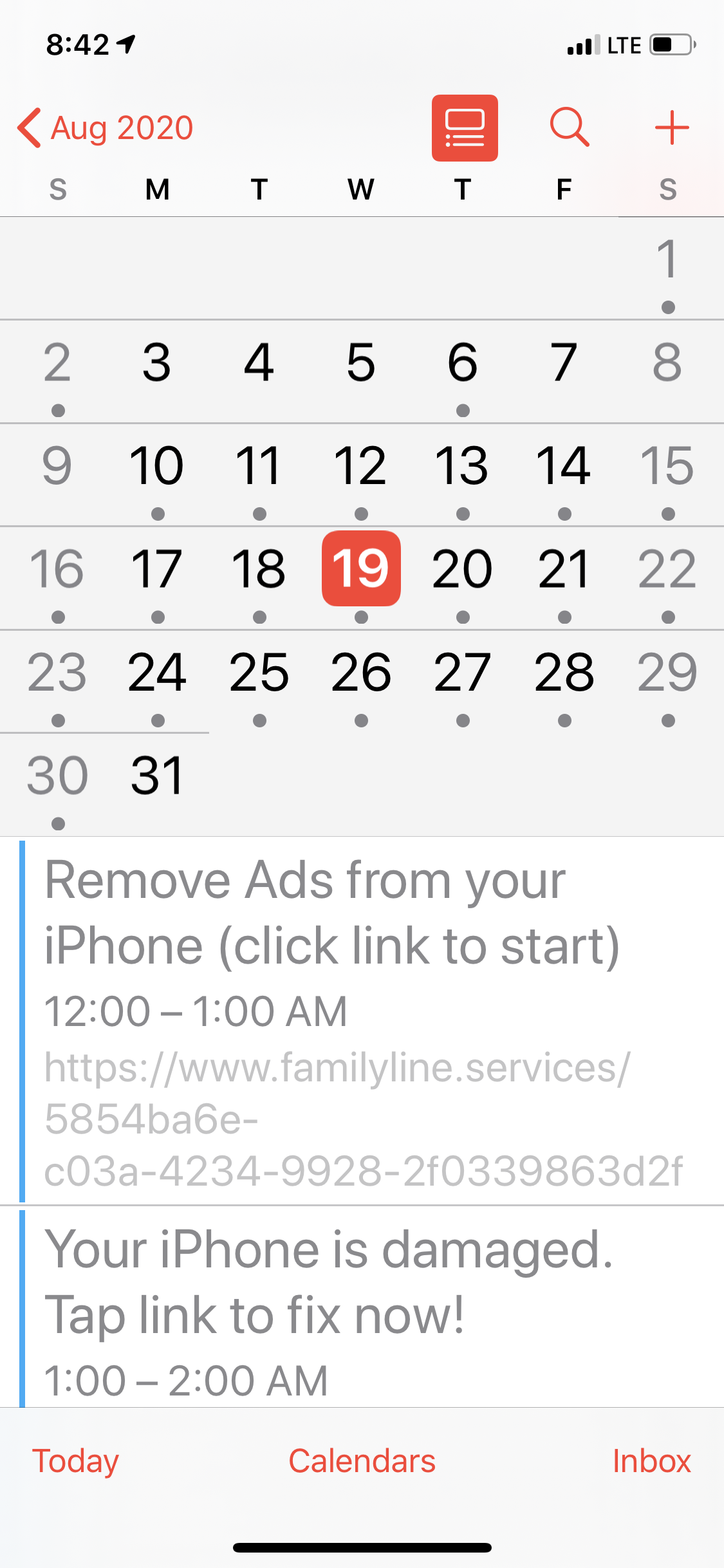 I accidentally pushed on a pop up family line.services and now it keeps showing up in my calendar everyday and sends notifications every hour. I tried everything and can’t remove it. It keeps popping up! Help please!