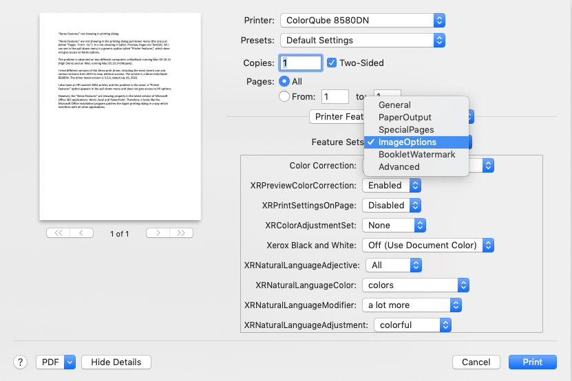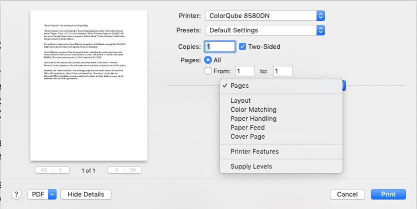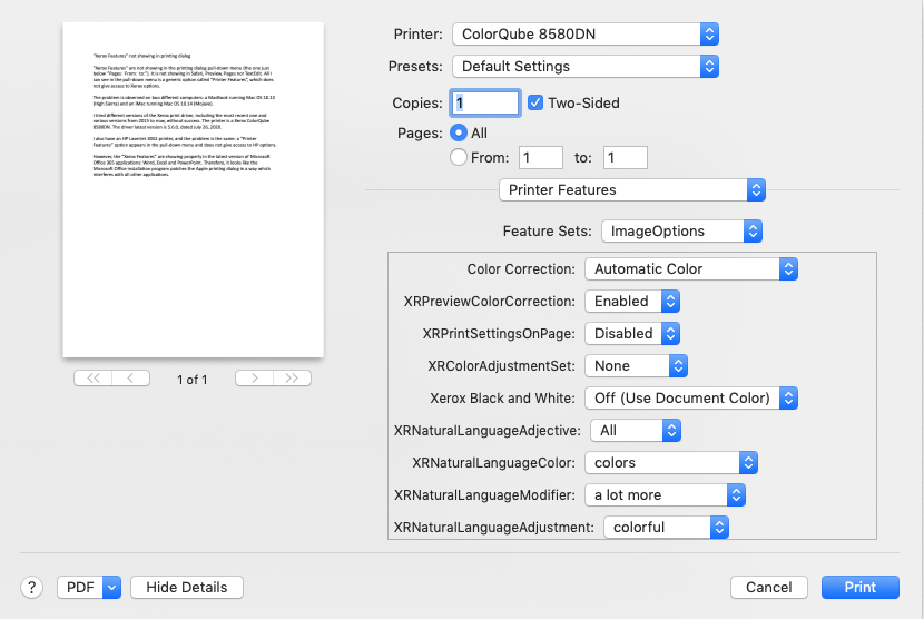 However, the “Xerox Features” are showing properly in the latest version of Microsoft Office 365 applications: Word, Excel and PowerPoint. Therefore, it looks like the Microsoft Office installation program patches the Apple print dialog in a way which interferes with all other applications.