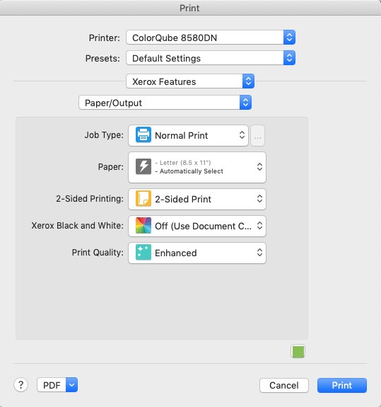"Xerox Features" are not showing in the print dialog pull-down menu (the one just below “Pages: From: to:”). It is not showing in Safari, Preview, Pages nor TextEdit. All I can see in the pull-down menu is a generic option called "Printer Features”, which does not properly give access to Xerox options.