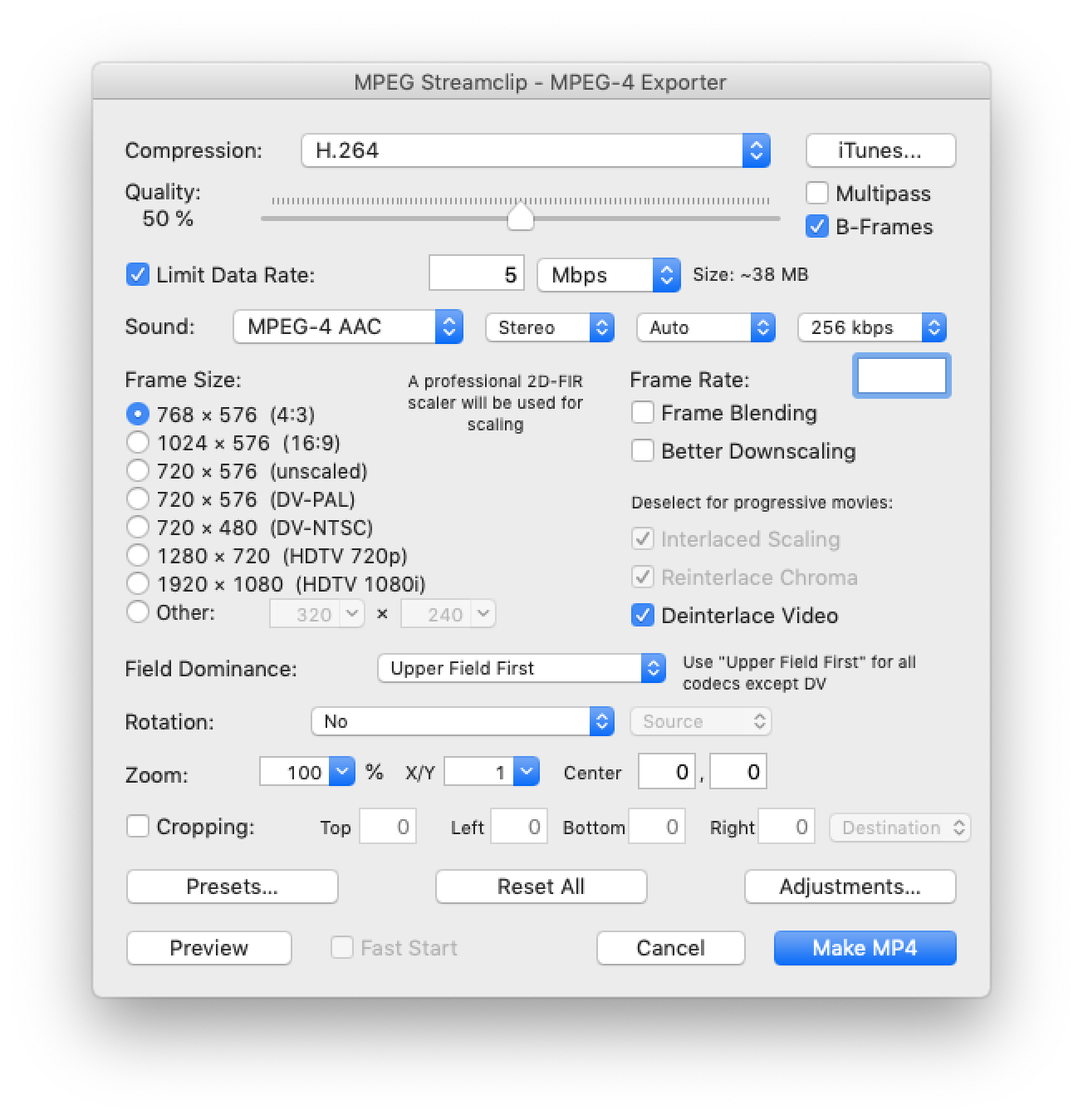 Then just click "Make MP4". The output is H.264 with the original frame rate and audio sampling (48 kHz audio recommended although some iMovie versions erroneously set it to 32 kHz).
