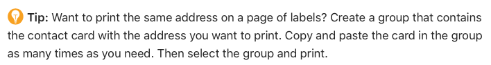 The Help instructions include a tip on how to make a sheet of labels all with the same address. Except, it doesn't work. It won't let me copy and paste the same contact into a group like the tip says to do. Am I doing something wrong? Is this something Catalina changed? How do I get this to work?