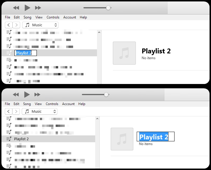 However, if you miss the opportunity, all you need to do is double-click the new playlist name (usually Playlist, but in my case, because I already have one by that name, it's Playlist 2) and it will be highlighted in blue. Then you simply type in the new name. You can do this is the sidebar or in the right-hand window: