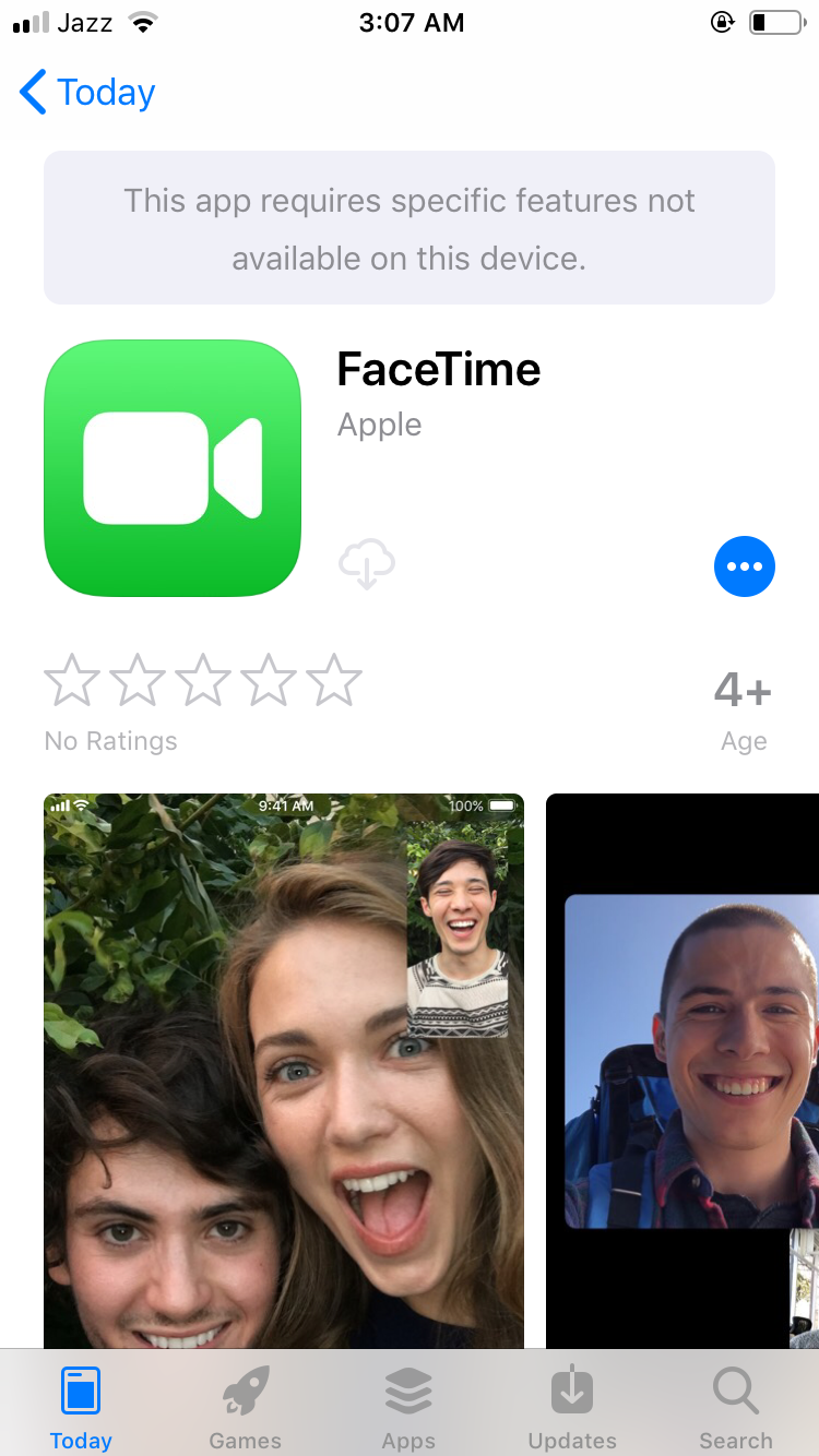 When go to App Store to download face time it show that app requires specific features that not available on this device please help me to solve it thank you