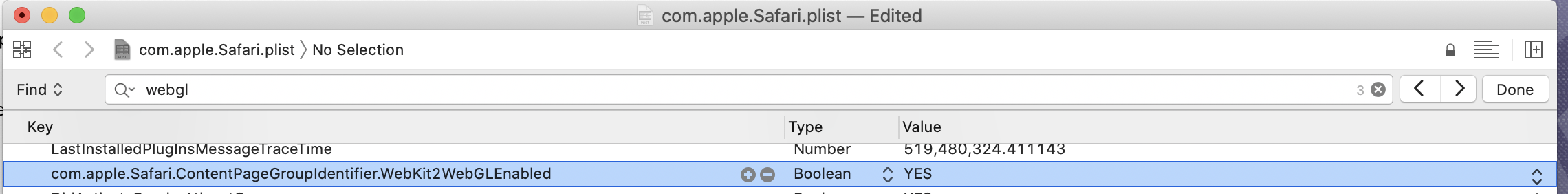 XXXXXX ~ % defaults write com.apple.Safari WebKitPreferences.webGLEnabled 1