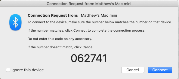 I am receiving near-constant Bluetooth connection requests from my Mac mini to my iMac. This pop-up window appears literally 5-10 times per minute with a different connection code each time. I have 3 options in the pop-up window: Connect, Cancel, or a checkbox for "Ignore this device." I have clicked on each of them multiple times but to no avail. The pop-up window returns soon after. I have tried the following: