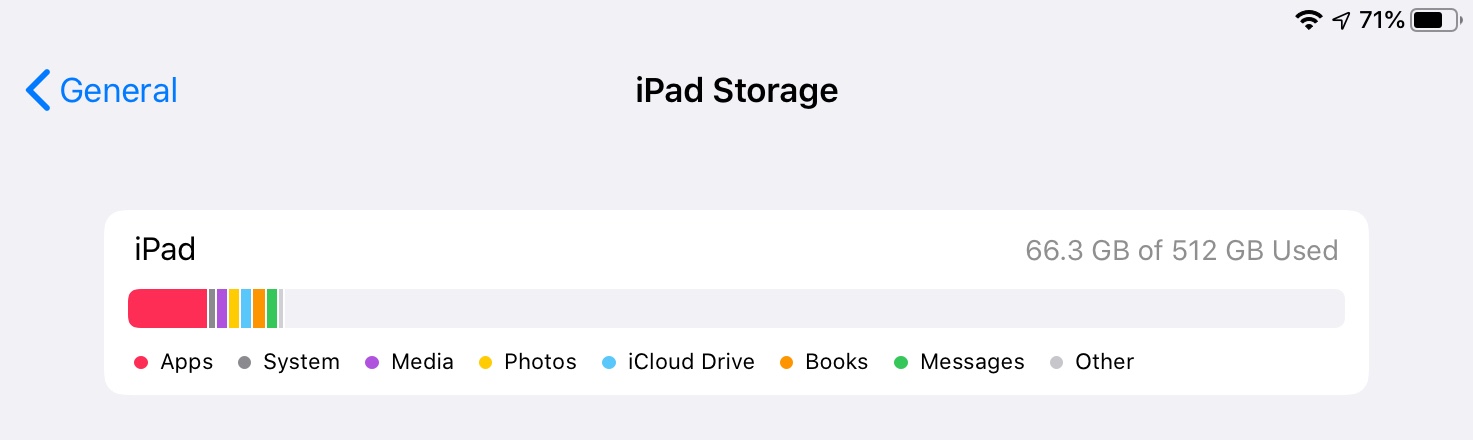 In this illustration, you can see the relative usage of different categories of data locally stored on the iPad. Here (looking from the right), the largest light-grey bar is empty/free space, then you’ll see a very small darker-grey bar corresponding with “other”, then a green bar for “Messages” and so on.