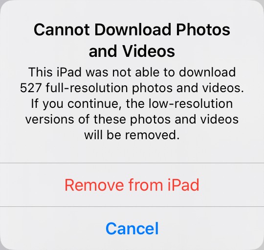 Im trying to unlink my ipad to icloud photos and keepiing them on my device but it says this. How do I make it download them?