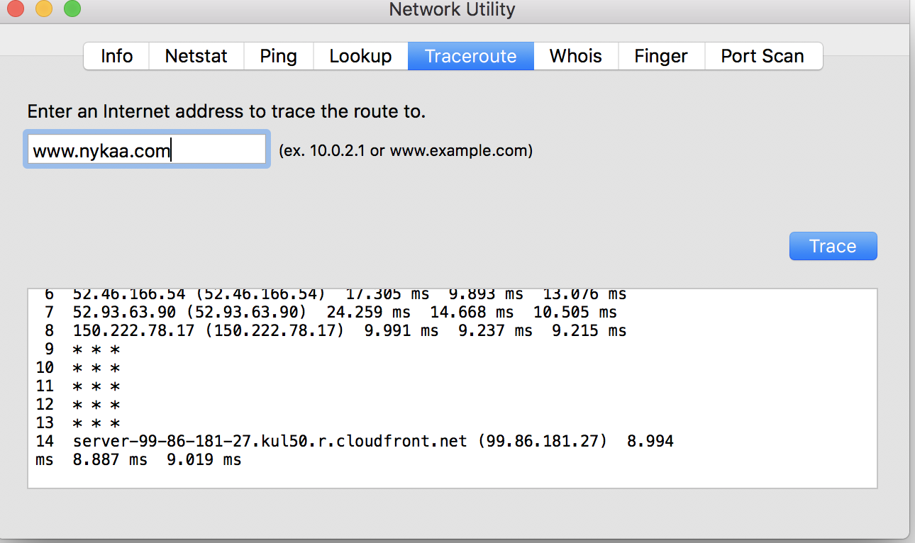 I've cleared my cache, cookies and browsing data. I've also closed programs and started it again. I'm restarted my laptop. I tried to use a different browser (safari and chrome). I used a different device, my iphone, connected to a different internet connection and nothing is working. I saw on another thread to run traceroute on network utility and it shows the following -
