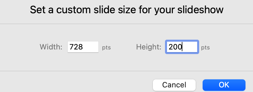 I love using Keynote for web ads, but it won't let me make anything smaller than 200 x 200 pixels, or 200 pixels in either directions. Is there anyway I can force it to be 728 x 90?