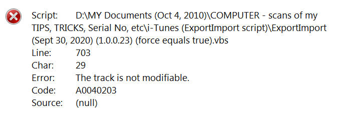 I've been away from things for a couple of days. I"m fine-tuning some Beatles tracks and was trying to replace some versions with different ones and it was the perfect thing for the Export/Import script. I used both the 1.0.0.23 (force equals true) and 1.0.0.22 and I'm getting an error message so I must be doing something wrong. Here are my steps.