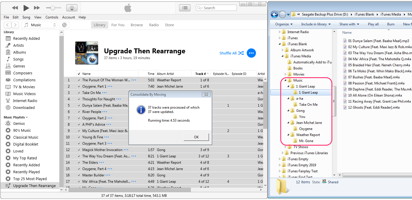 The script then examines each selected item in turn, calculates the intended path for that item, compares with the current location, and if necessary moves it, doing all the other housekeeping that is necessary to keep the track connected to iTunes (and in turn to any playlists it belongs to etc.) removing emptied folders, moving any folder art, etc. These are all things you can do by hand, but only with great effort.