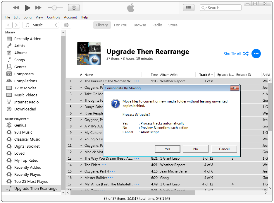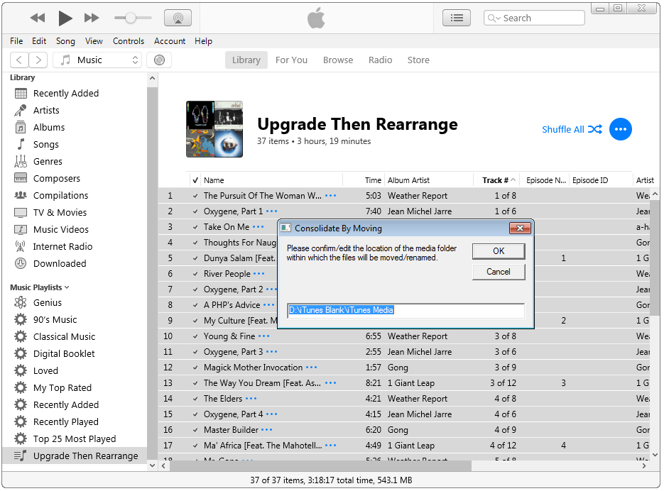 The script would first ask for confirmation that you want to process the selected number of tracks, and allows for it to run automatically, or for you to give track by track confirmation of each action. You're then asked to edit or confirm the suggested media folder where the tracks are going to be moved to. For reasons discussed elsewhere (see Make a split library portable - Apple Community) I generally recommend this is X:\iTunes\iTunes Media, where X: is the drive hosting your library, but it can be wherever you want all of music files to live.