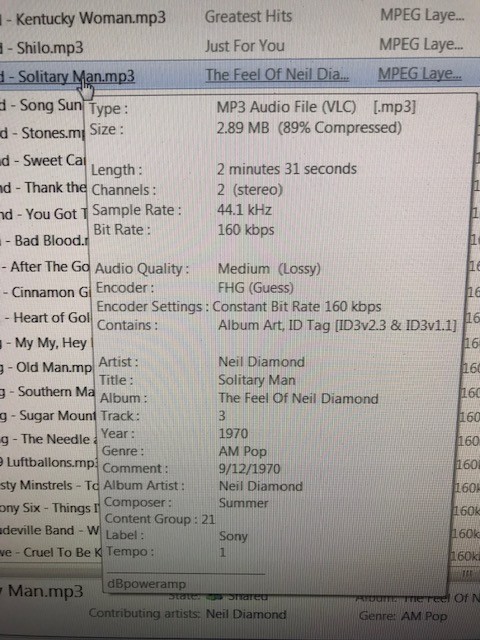 I then check iTunes and all is showing right and the songs are playing correctly. So I'm not sure why the data is missing from Windows and the ID3 tagging program as shown above.