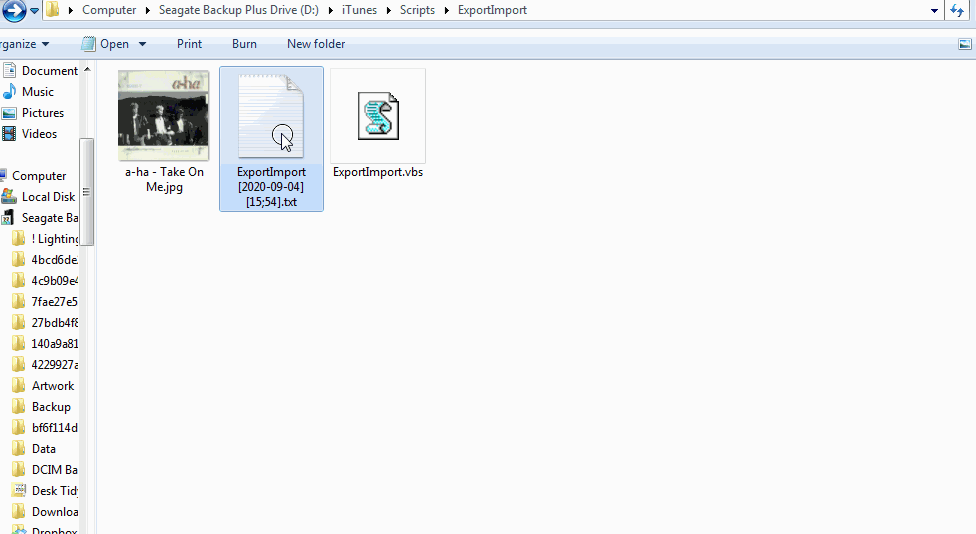 Note too the artwork image in the same folder as the script and the exported text file. This was created during the export phase and is what will be used during import to add artwork to the new copy of the track. Each export creates a new output file. Once you've imported that file you don't need to keep it or the artwork images that were created.