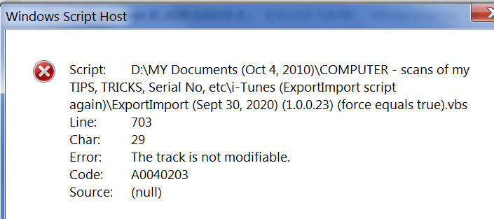 2. So today, I thought I would just use the Export/Import script and not worry about creating a playlist. So I highlighted the 10 songs from a Paul Simon album. I did the usual sequence (highlighted the songs, ran the E/I script - 1.0.0.23, and it gave me the .txt file. I then moved the 160 baud songs out of the folder they were in. I copied in the new lossless version. I dragged the .txt file onto the script (1.0.0.23) and it worked, but eventually threw the error I've been getting. I did see that it worked for some of the 10 songs but not all of them. They were all in the same folder as the 160's were so I'm still stuck as I've been now for over 5 weeks.