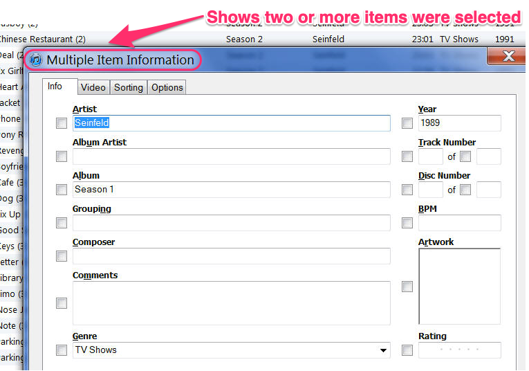 YOU SAID: You're showing the multiple item dialog so some fields aren't shown. You should not fill in Track Number, Episode ID, or Episode Number in this mode.