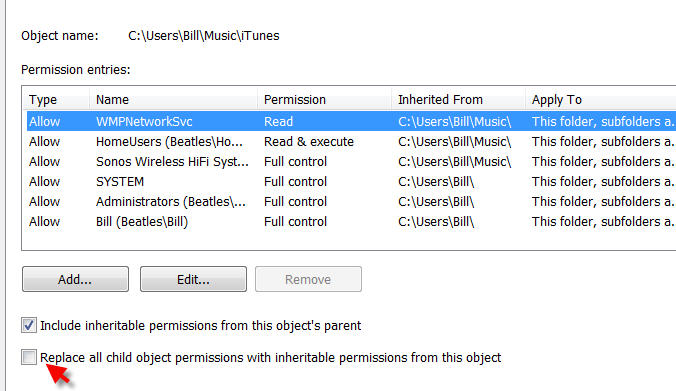 YOU SAID: Yes, should you find that you or SYSTEM don't have full access then grant that, and make sure they're not marked as read only. Might be worth checking iTunes > Get Info > Options tab and seeing what the id3 tag is declared as.