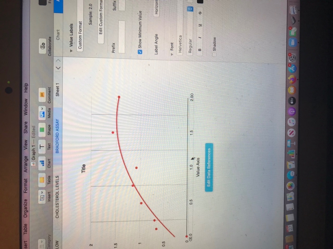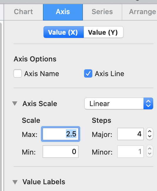 I am using Numbers to create a graph but I do not know how to change the numbers along the x-axis. I would like to change the numbers to 0 0.625 1.25 and so on. Any help would be amazing thank you very much.