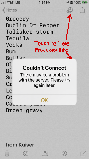 We keep our grocery list in a Note shared among Notes on iCloud, an iPad, an iPhone 6, an iPhone 5c, A 2009 MacBook Pro running El Capitan, a 2015 MacBook Pro running Mojave, and a (new) iPhone SE. All sync flawlessly with each other EXCEPT my iPhone SE does not update the grocery list very often. When I touch that little sharing icon second-from-the-right-at-the-top-of-the-Notes, the iPhone screen flashes and produces an alert: