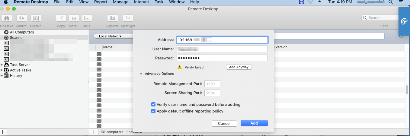 How can I add all client Mac machines(which are connected to client network) to ARD Admin (which is connected to my Local network)?"