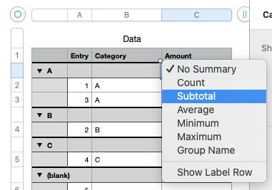 What do you mean by "subtotal command"? Are you referring to Categories, as in this 'Categories' template at File > New in your menu?