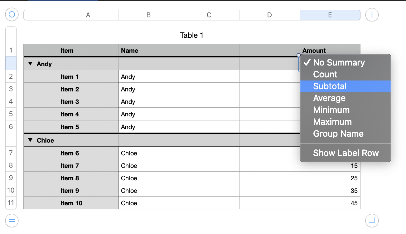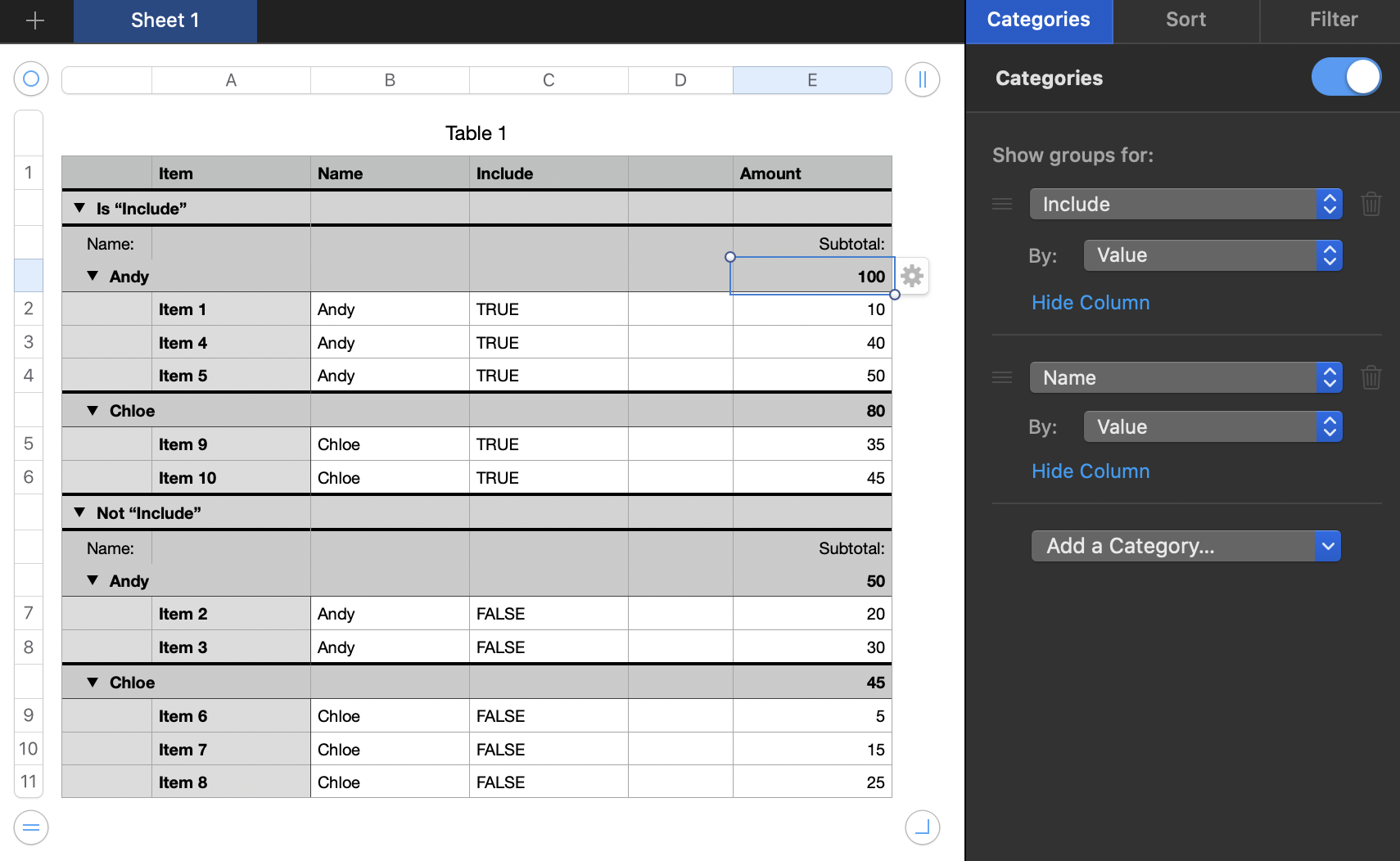 Say you want to filter on TRUE here and get filtered subtotals for Andy and Chloe. You could do something like this: