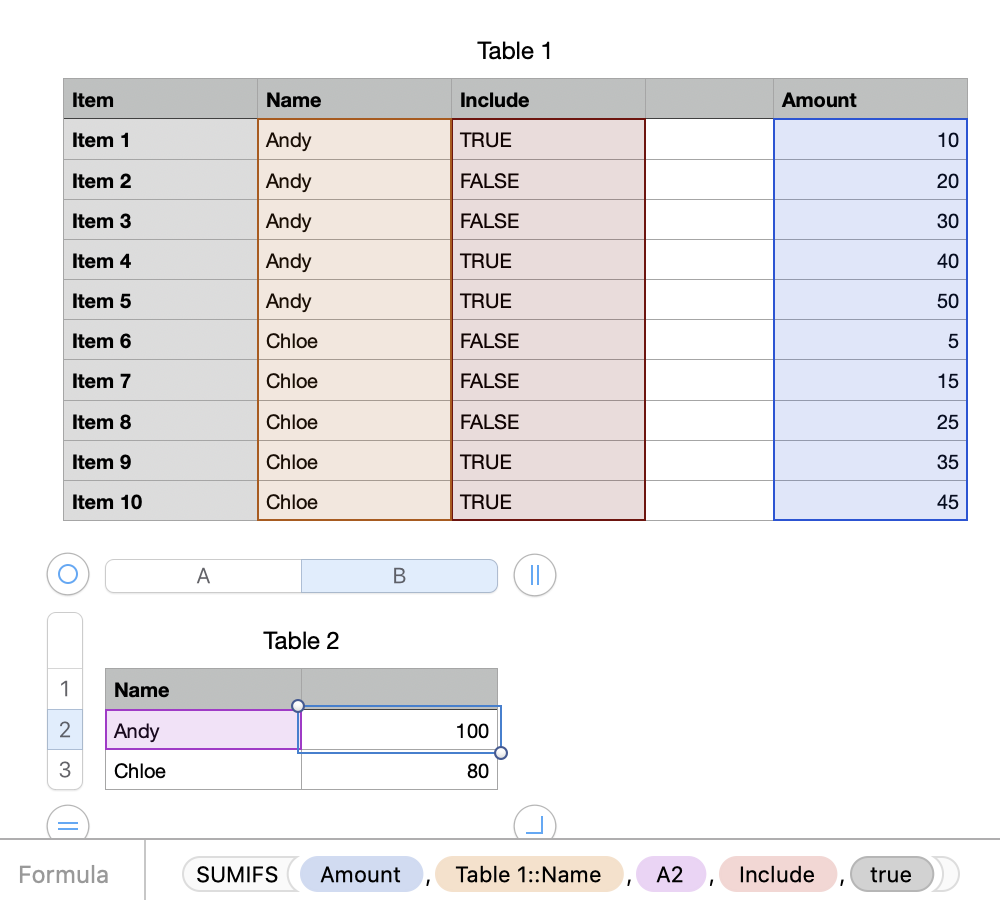 =SUMIFS(Amount,Table 1::Name,A2,Include,TRUE)