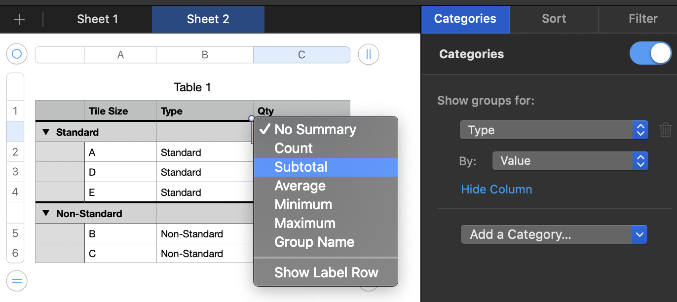 One way to get subtotals for a filtered dataset is to use SUMIFS.