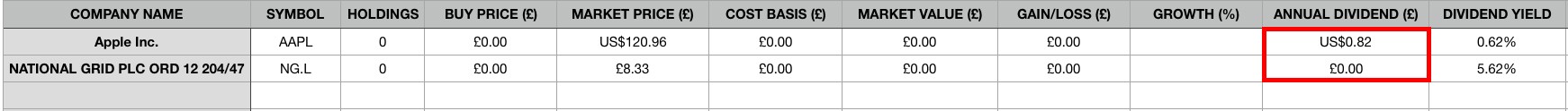 I am trying to get my document to auto fill the "Annual Dividend" of a UK stock, but it is just showing a value £0.00. The formula STOCK(SYMBOL Apple Inc.,"annual dividend") seems to work just fine for US stocks like Apple. Anyone had the same problem with UK stock?