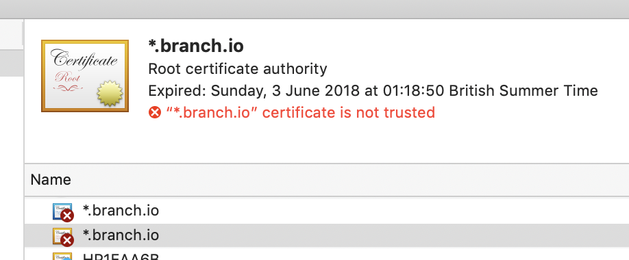 What is *.branch.io in Keychain? Why is Root Cirtificate Not Trusted?