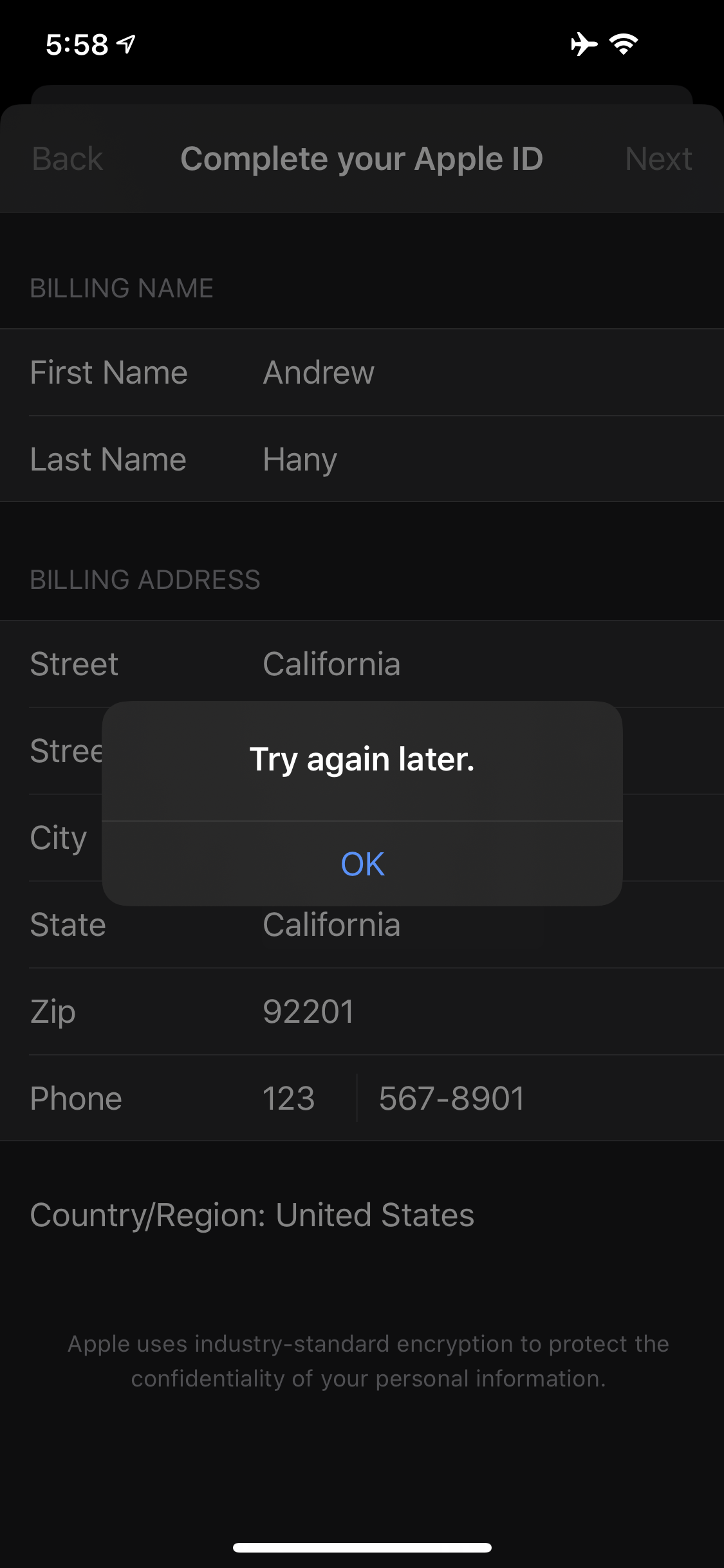 id when i download any app it appears a small message telling that i have to change it from my region to us store and i changed it to us store and finally i press next and it appears a mesage sayying TRY AGAIN LATER and i tried this process more than once and it doesn't works