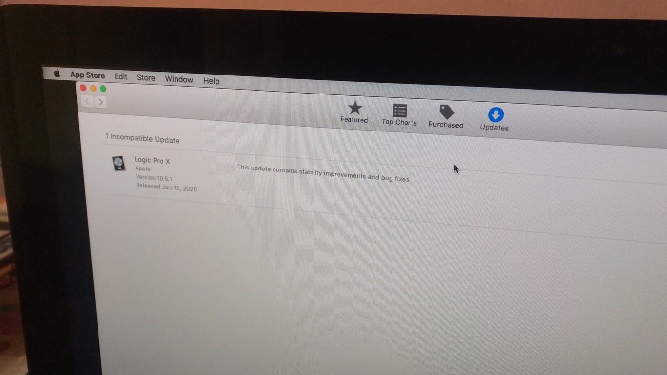 when I click on software update, it shows no update available and one incompatible update, which is Logic Pro x.