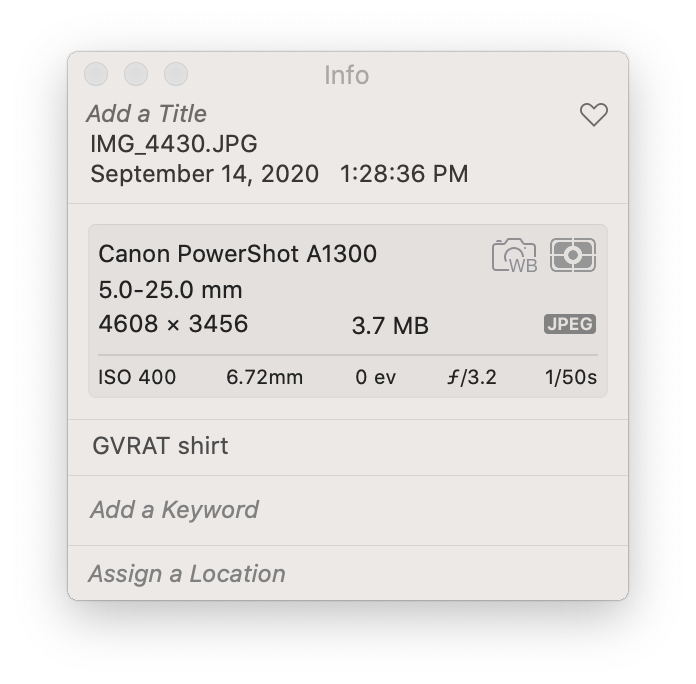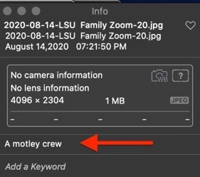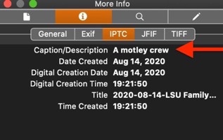 BUT -- when I had him import a photo from my camera (Canon PowerShot A1300), add a Description, export 1 photo, and open in Preview, the Description was not exported. We both created a Keyword and a Title -- those and a location were included in the exported JPEG successfully.