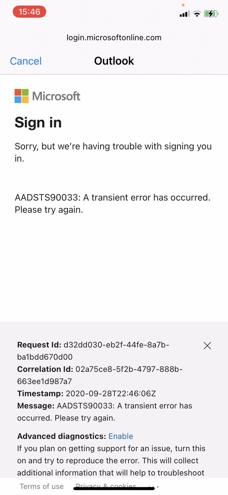 Normally you could go to Settings>Mail>Accounts>+>Outlook to enter the info for your Outlook account or to create a new one. However, some security check on Microsoft’s side has made the page to set up or verify the account impossible. it attempts to go to login.microsoftonline.com, but that page gives U.S. the error in the pic below.