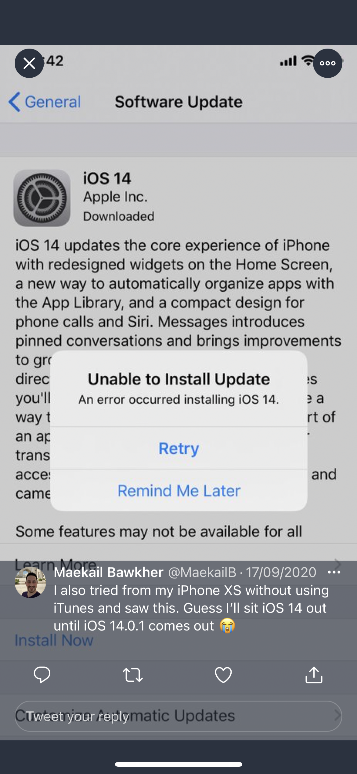 Below is the error message I tweeted to Apple support when iOS 14 came out. It appeared when installing iOS 14 on my old XS. Removing the passcode may not have been necessary, but after doing that I was able to install it OTA. Correlation or causation 🤷🏻♂️
