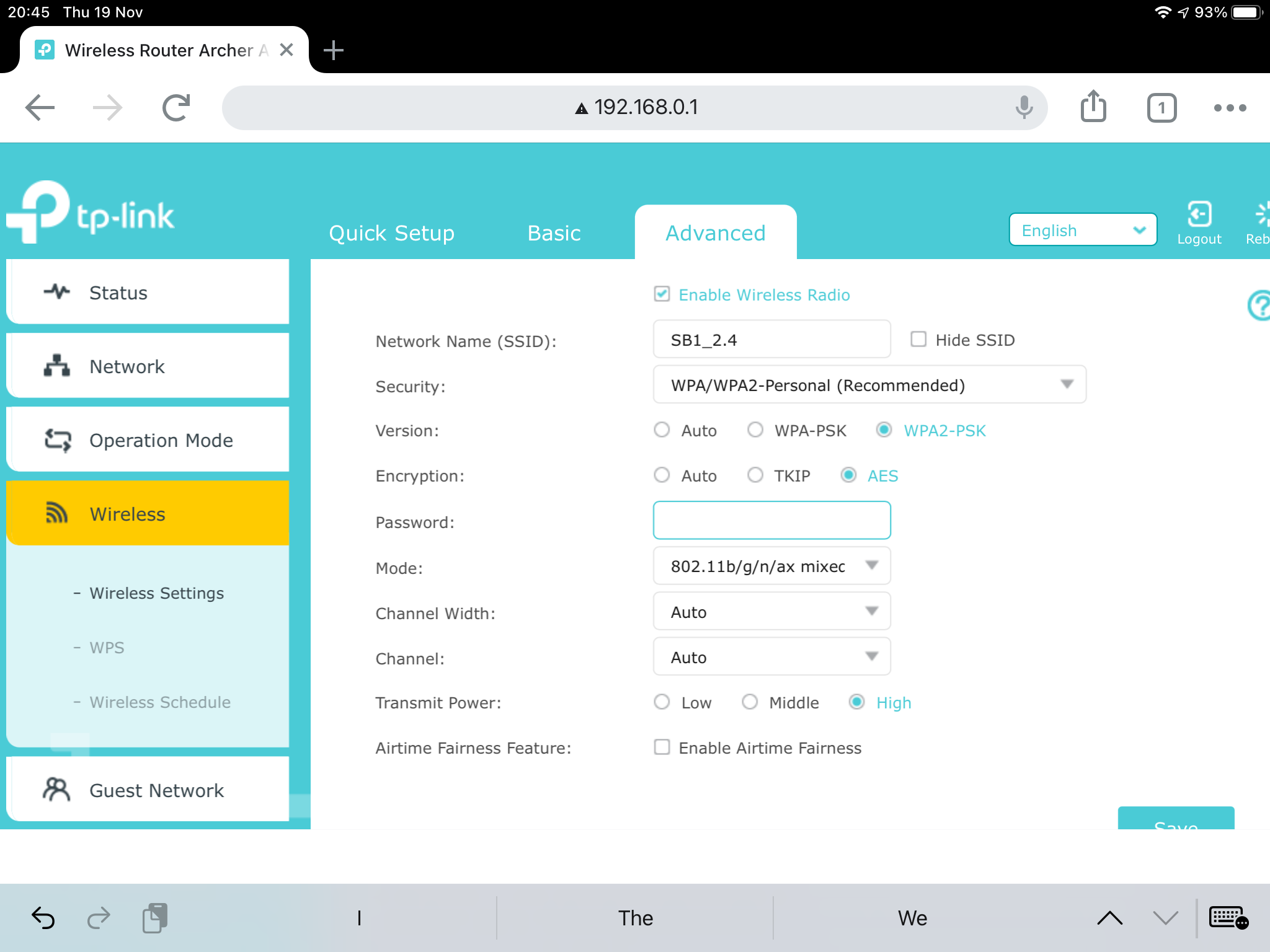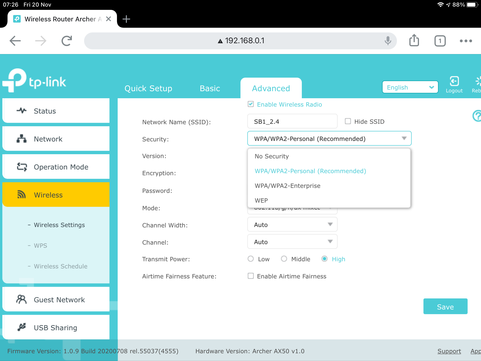 Once in the settings pages, go to the wireless settings. You should be able to find a drop down menu for the security options. Change it to use WPA2 only, or WPA2/WPA3 if you have that option. Save the settings (the router may tell you it has to be restarted).