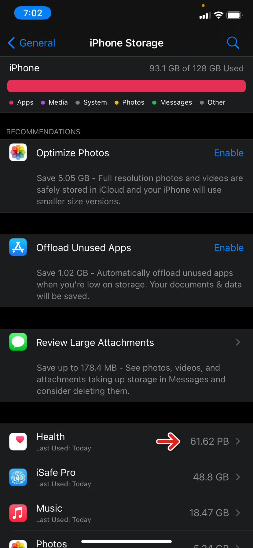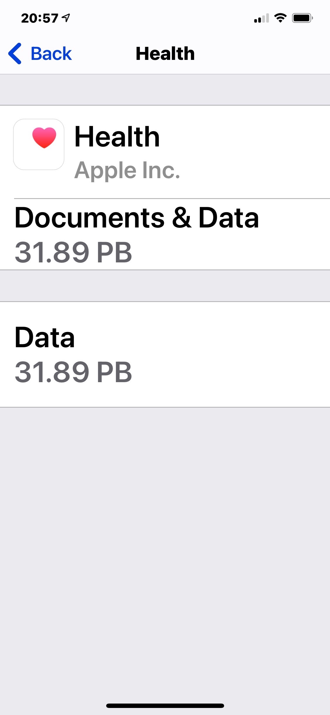 Deleted all of the Health App data, however is still showing as using 20.44GB