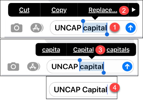 If a word is in all-caps, double-tap it; replacement words should show up below; tap any desired replacement.