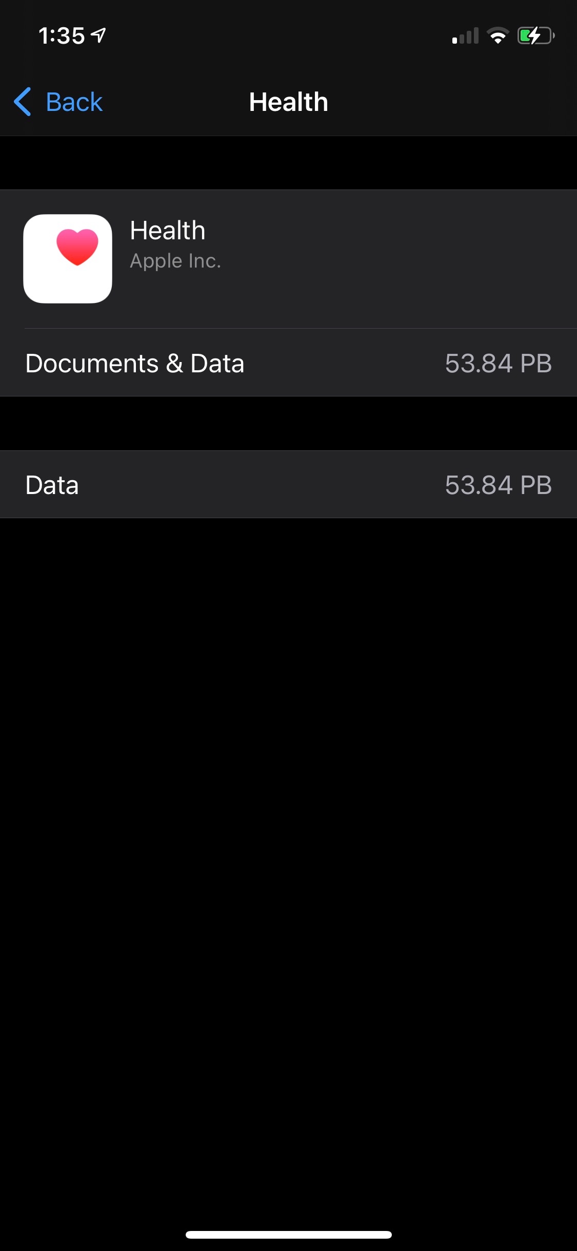 Same. Just updated to iOS 14 couple of days ago.. Health app taking up 7 Petabytes which is impossible. Storage bar shows 26 GB used out of 64 GB used though.
