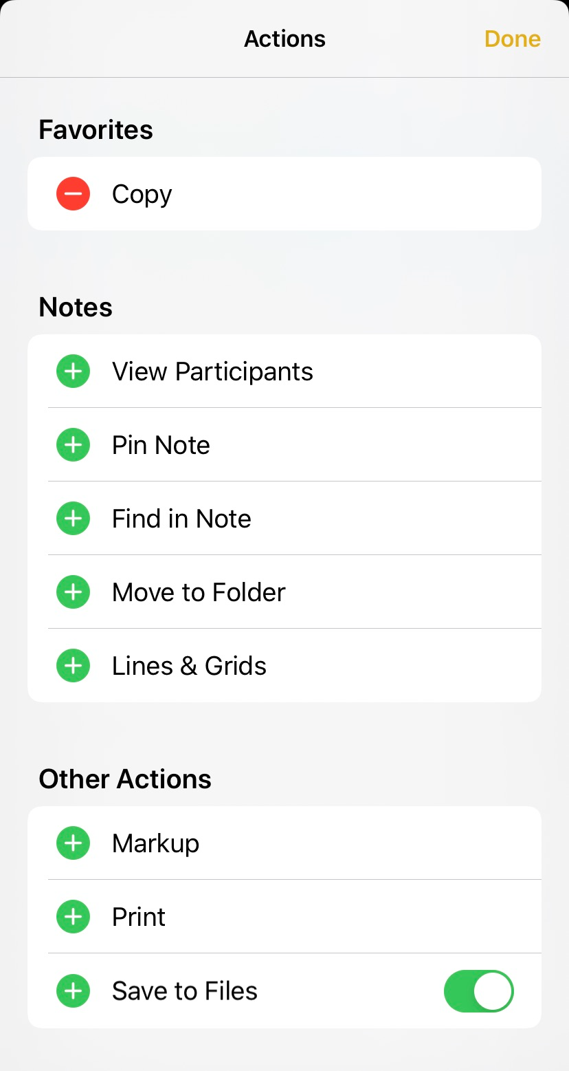 I want to secure a note that contains sensitive information on my iPhone. I have IOS 13.7 and I'm following the instructions in Apple support article "Lock notes on your iPhone, iPad, iPod touch, and Mac" (https://support.apple.com/en-us/HT205794). Once I get to the step about locking a note using the action button within the note, I can't go any further. There is no option on the action menu to "Lock Note" or anything like it. I've attached a screenshot of what I'm seeing, including the Edit Actions sub-menu.