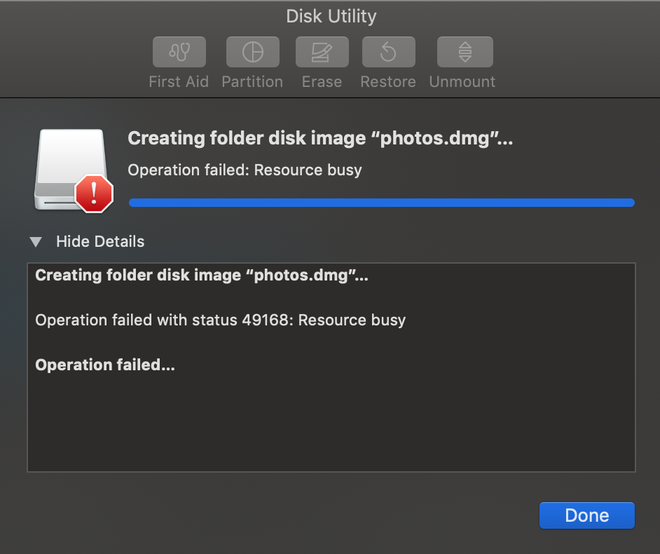 I tried to password protect a folder using Disk Utility in macOS Mojave, but then I encountered an error like this:
