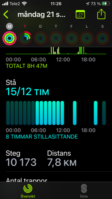 Watch/phone registering standing, but not counting all hours, see picture (6 light blue only 4 counted yesterday the other way around 9 light blue 15 counted)