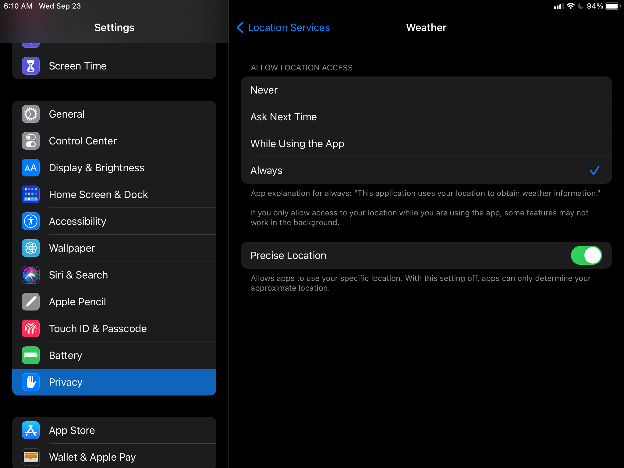 The location setting for the Weather widget in new iPadOS14 is always showing Cupertino. I searched here and did what the user lakmis suggested at https://discussions.apple.com/thread/7692711?login=true but it didn’t help. I later found out that if I press on the widget, I can change the location to “My Location” but it is still not working. Any suggestions? Please the screenshots of what I am seeing