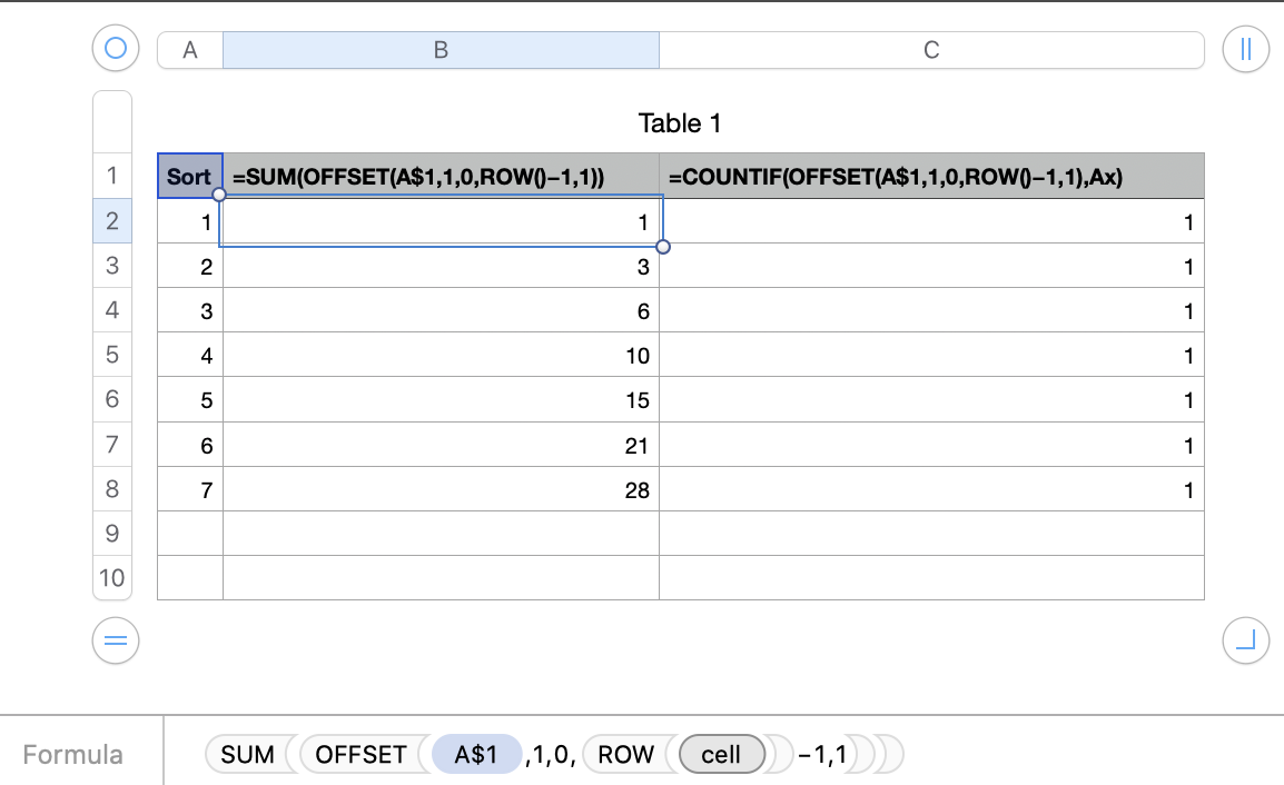 Numbers 10.2 did not fix the problem with sorting of tables that have formulas such as =COUNTIF(A$2:A4,A4) in a column. We use that kind of formula a lot here and this bug makes those tables unsortable. Table 1 in the screenshot is the original table. The "x" in "Ax" in the headers refers to a row number, like in the formula above. When sorted by column A in Table 1-1, the A$2 part of the range reference gets mangled, same as before. The lower rows came out correct but rows 2 and 3 are wrong.